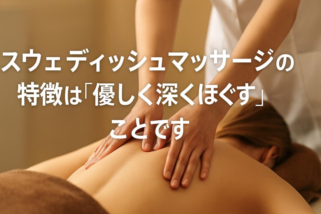 スウェディッシュマッサージの特徴は“優しく深くほぐす”ことです スウェディッシュマッサージの最大の特徴は、「優しさの中にしっかりとした効果がある」という点です。よくある強揉みのマッサージとはまったく異なり、痛みを感じるほどの強い圧ではなく、... -